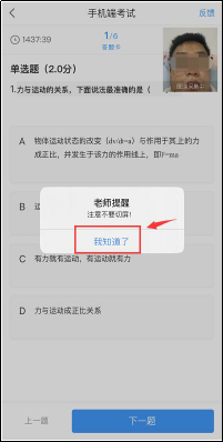 (五)考試在接收到監(jiān)控老師提醒后,需點(diǎn)擊“我知道了”,方可繼續(xù)答題。