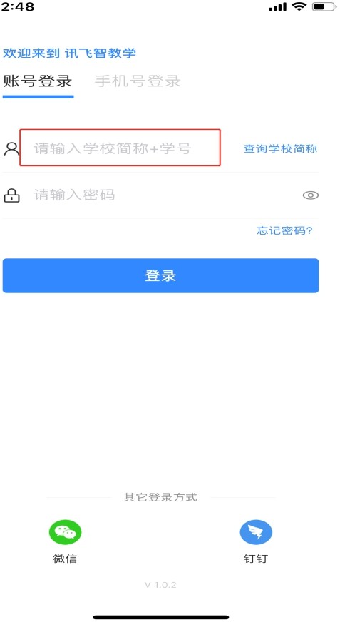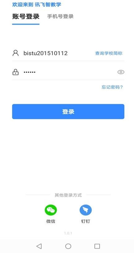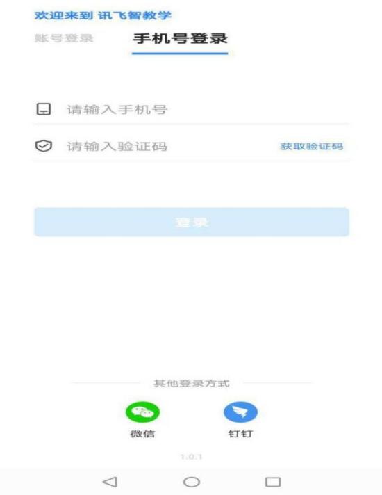在賬號(hào)已綁定手機(jī)號(hào)、微信或者釘釘?shù)那闆r下,可以直接使用手機(jī)號(hào)、釘釘或微信進(jìn)行直接登錄,點(diǎn)擊登錄后自動(dòng)進(jìn)入訊飛智教學(xué) APP 首頁(yè)。