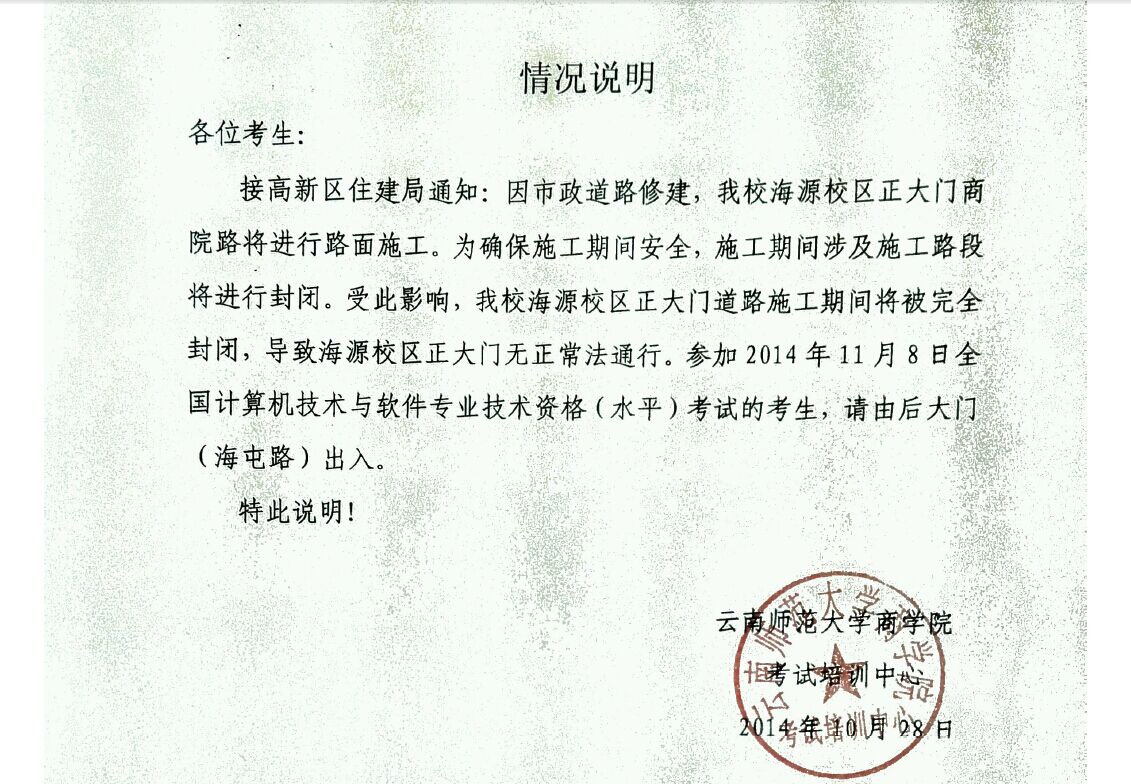 在云南師大商學院考點參加2014年11月8日全國計算機技術(shù)與軟件專業(yè)技術(shù)資格考試的考生,請由位于海屯路上的后大門出入。