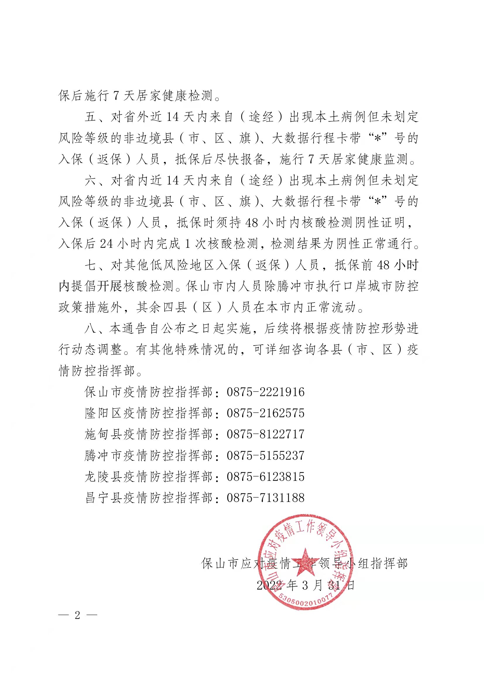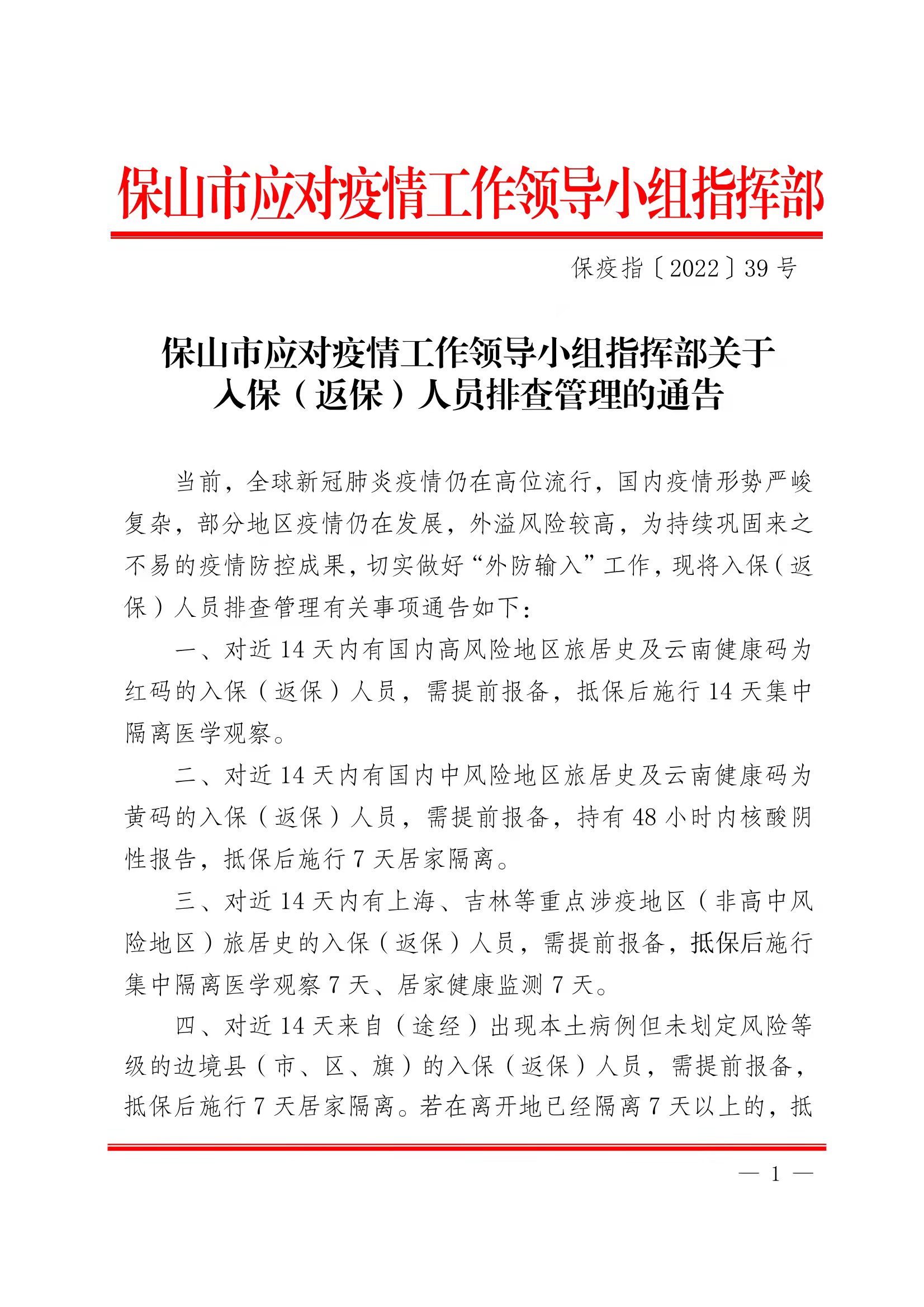 附件:保山市應(yīng)對疫情工作領(lǐng)導(dǎo)小組指揮部關(guān)于入保(返保)人員排查管理的通告(保疫指〔2022〕39 號)