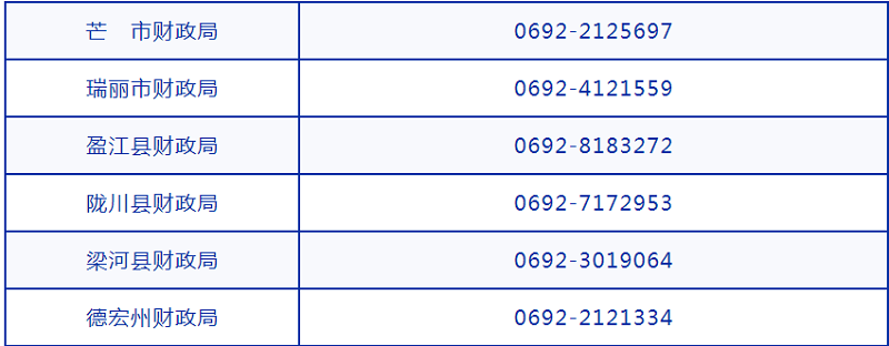 請隨時(shí)關(guān)注德宏州財(cái)政局門戶網(wǎng)站和德宏財(cái)政微信公眾號(hào)公布的相關(guān)信息。如有疑問,請咨詢德宏州各縣市財(cái)政會(huì)計(jì)管理部門。
