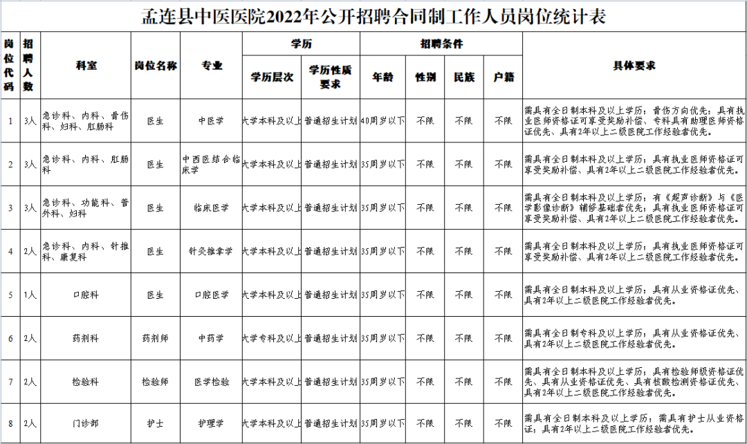 1.孟連縣中醫(yī)醫(yī)院2022年公開招聘合同制工作人員崗位統(tǒng)計(jì)表