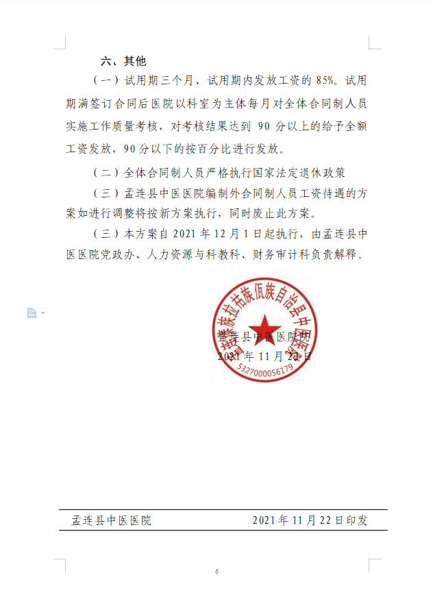 (二)待遇按照《孟連縣中醫(yī)醫(yī)院編制外人員工資及待遇方案(試行)》、《孟連縣中醫(yī)醫(yī)院編外合同制人員管理規(guī)定(試行)》執(zhí)行;