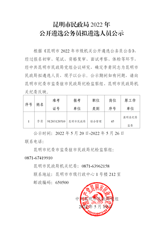 昆明市民政局2022年公開(kāi)遴選公務(wù)員擬遴選人員公示
