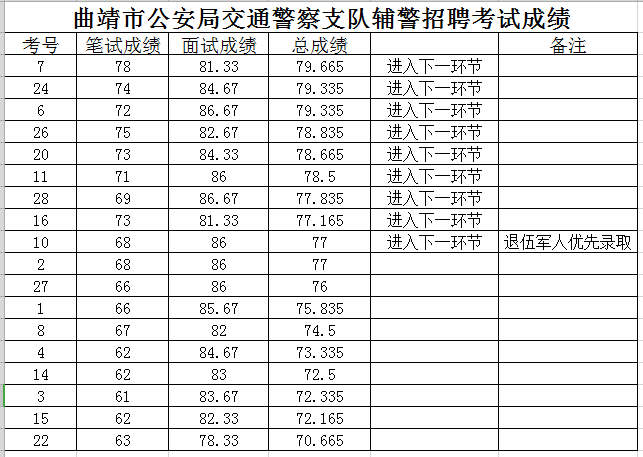 關(guān)于公布曲靖市公安局交通警察支隊(duì)公開招聘輔警考生考試總成績的通知
