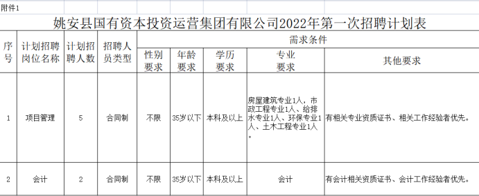 詳見附件1:姚安縣國有資本投資運營有限公司2022年第一次招聘計劃表