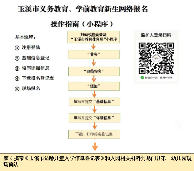1.網(wǎng)絡(luò)預(yù)報(bào)名信息登記:易門縣第一幼兒園招生對(duì)象監(jiān)護(hù)人(母親手機(jī)號(hào)碼優(yōu)先),于2022年6月20日—6月24日期間,通過掃描二維碼或微信搜索“玉溪市教育體育局”微信小程序,“業(yè)務(wù)”選項(xiàng)中的“網(wǎng)絡(luò)報(bào)名”模塊,按操作提示,完善子女信息,家長(zhǎng)確認(rèn)并提交信息,提交成功后打印《玉溪市適齡兒童入學(xué)信息登記表》簽字確認(rèn)。并于2022年6月23日—6月24日期間,帶入園相關(guān)材料、簽字確認(rèn)后的《玉溪市適齡兒童入學(xué)信息登記表》到易門縣第一幼兒園進(jìn)行報(bào)名信息確認(rèn)。