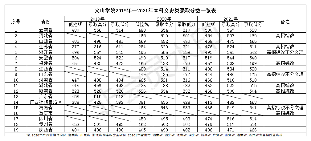 2019年—2021年文山學院本科文史類錄取分數(shù)一覽表