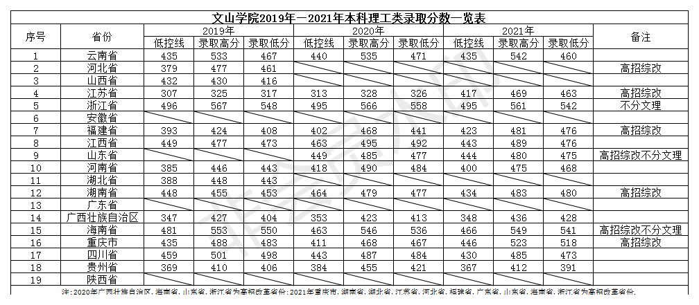 文山學(xué)院2019年—2021年本科理工類錄取分?jǐn)?shù)一覽表