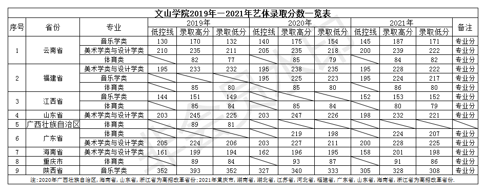 2019年—2021年文山學院藝體錄取分數(shù)一覽表