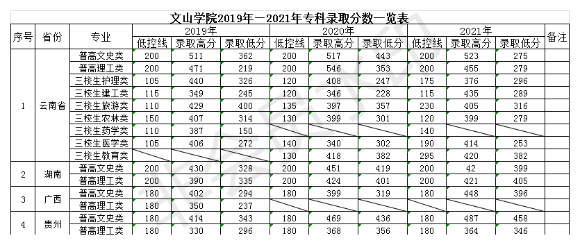 2019年—2021年文山學院專科錄取分數(shù)一覽表
