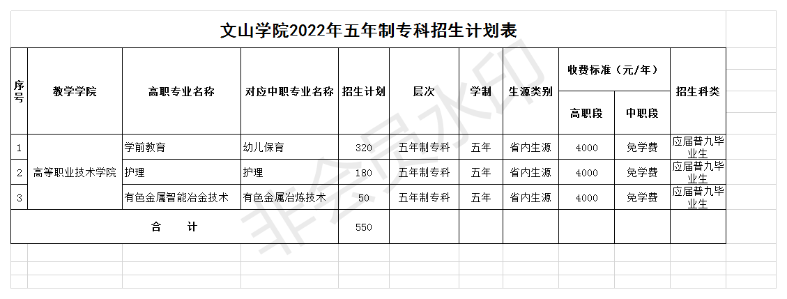 文山學院2022年五年制大專招生計劃表