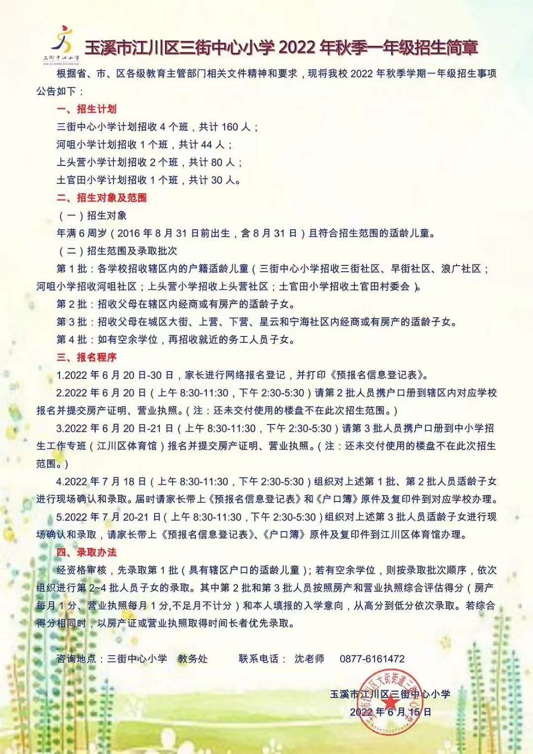 玉溪市江川區(qū)三街中心小學(xué)2022年秋季一年級(jí)招生簡(jiǎn)章