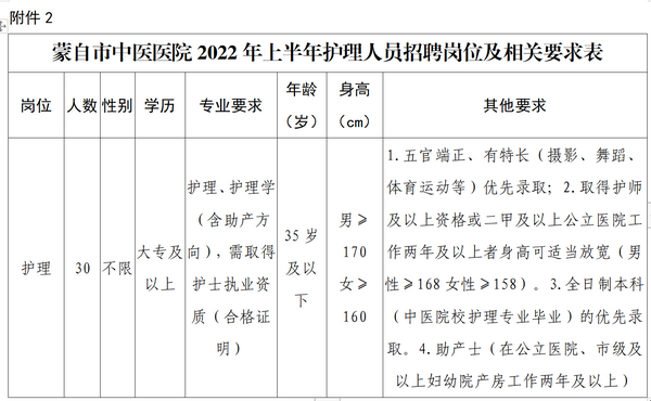 2.《蒙自市中醫(yī)醫(yī)院2022年上半年護理人員招聘崗位及相關要求表》