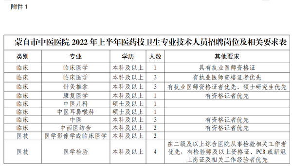 1.《蒙自市中醫(yī)醫(yī)院2022年上半年醫(yī)藥技衛(wèi)生專業(yè)技術人員招聘崗位及相關要求表》