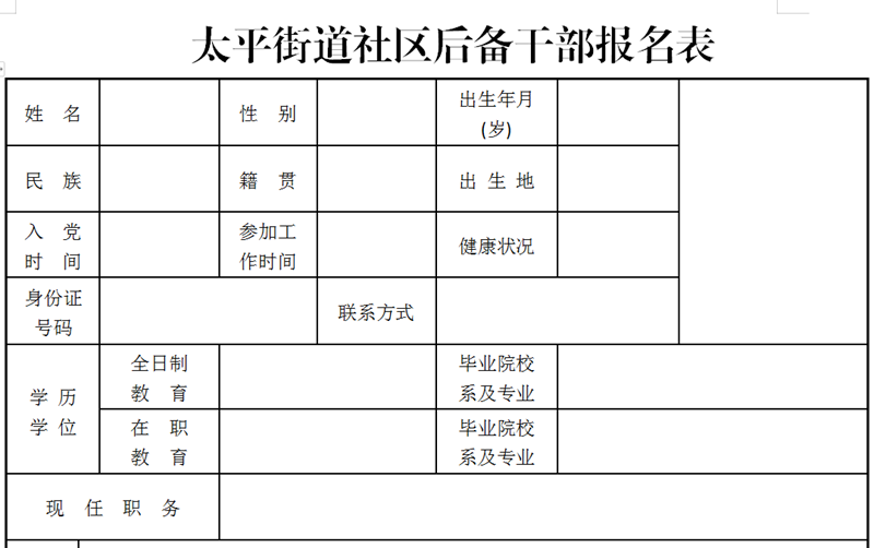 (一)自愿報名。報名時間從6月27日起至7月1日17: 00截止。報名人員需填報《太平街道社區(qū)后備干部報名表》,并于7月1日17:00前將報名表發(fā)送至郵箱334388657@qq.com,超過報名截止時間發(fā)送的視為放棄報名。填報內(nèi)容務(wù)必真實,經(jīng)核實填報內(nèi)容不真實的,將一律取消報名資格。