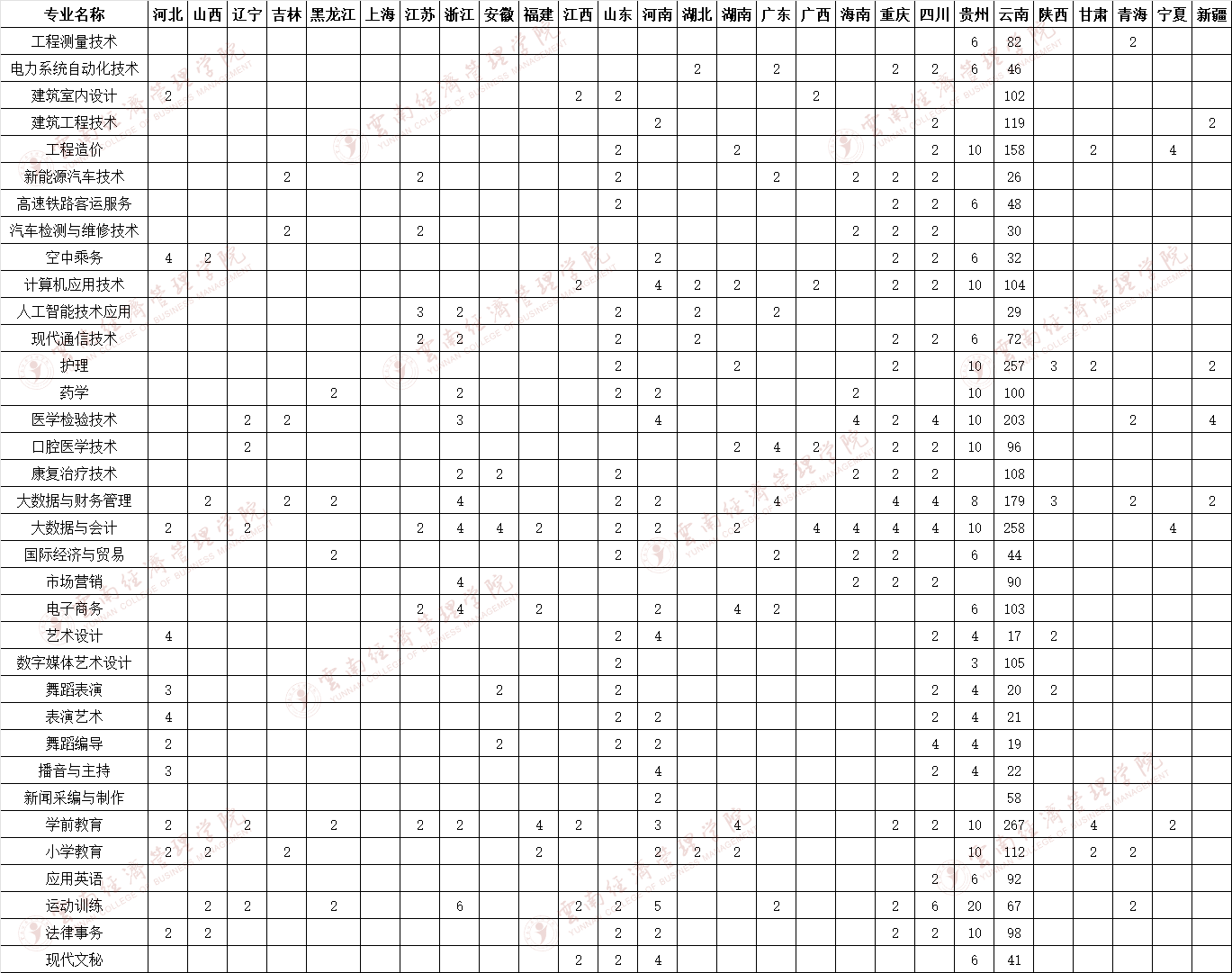 2020年云南經(jīng)濟(jì)管理學(xué)院本科各省專科