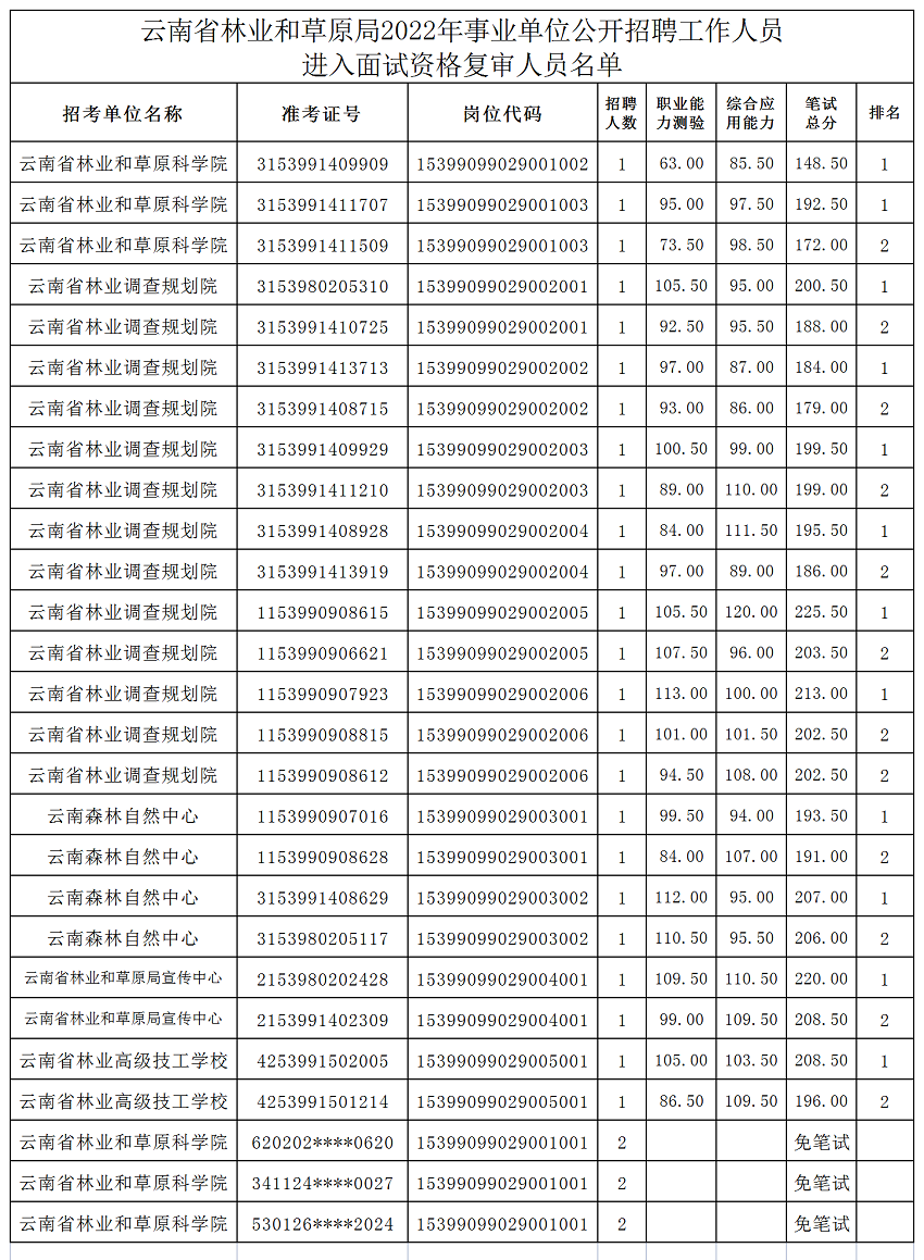 附件:云南省林業(yè)和草原局2022年事業(yè)單位公開(kāi)招聘工作人員進(jìn)入面試資格復(fù)審人員名單