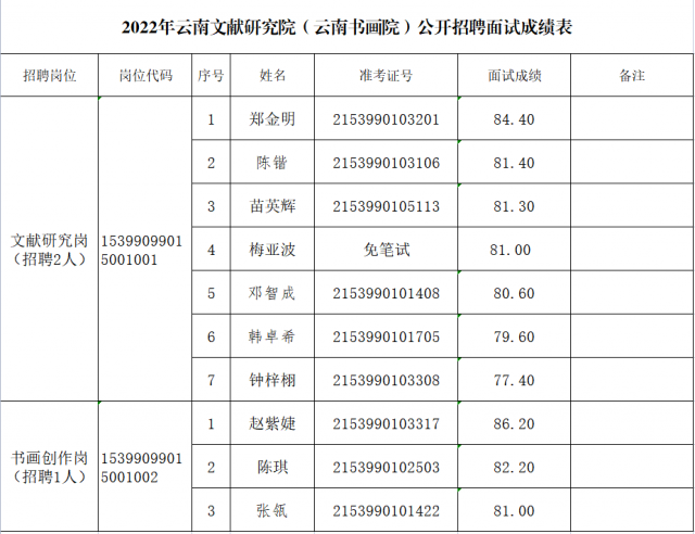2022年云南文獻研究院(云南書畫院)公開招聘面試成績表