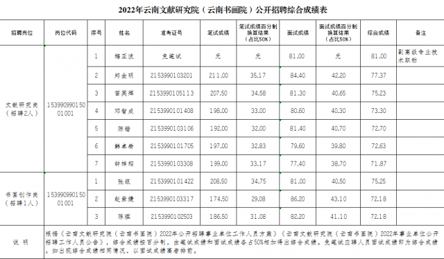 2022年云南文獻(xiàn)研究院(云南書畫院)公開招聘綜合成績(jī)表