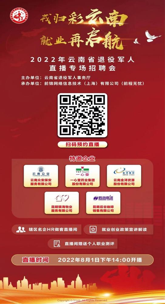 為深入貫徹黨中央、國務(wù)院和省委、省政府穩(wěn)就業(yè)保就業(yè)決策部署,促進(jìn)我省退役軍人充分穩(wěn)定就業(yè),省退役軍人廳定于8月1日舉辦2022年云南省“戎歸彩云南 就業(yè)再啟航”退役軍人直播專場招聘會(huì)?,F(xiàn)將有關(guān)事宜通知如下: