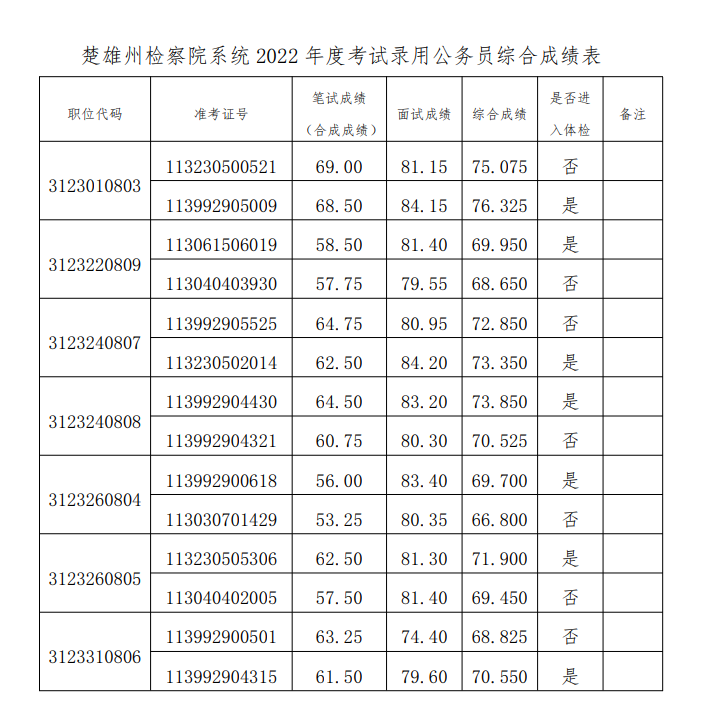根據(jù)《云南省2022年度考試錄用公務員公告》安排,筆試、面試工作已經(jīng)結(jié)束,現(xiàn)將報考楚雄州檢察院系統(tǒng)公務員考生綜合成績及后續(xù)工作安排公告如下。