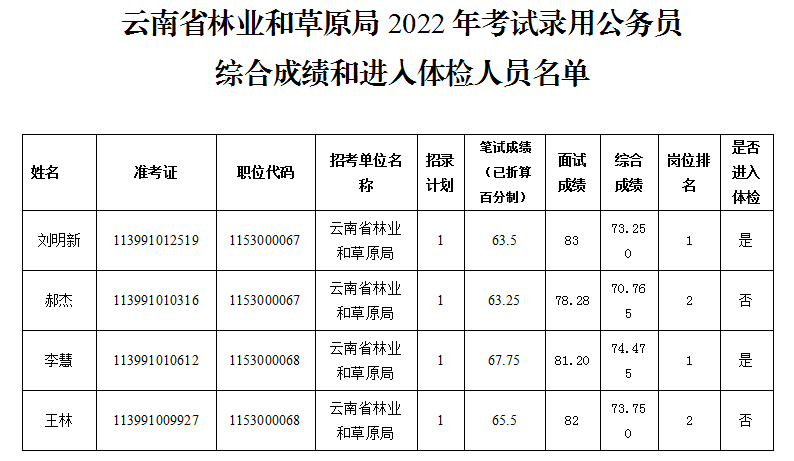 附件:云南省林業(yè)和草原局2022年度考試錄用公務(wù)員綜合成績(jī)表和進(jìn)入體檢人員名單