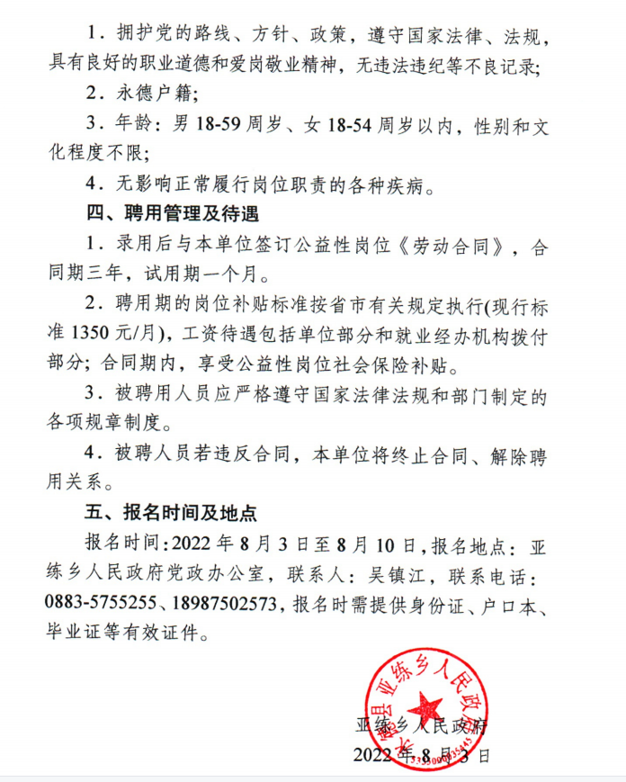 2022年亞練鄉(xiāng)人民政府公開招聘1名公益性崗位人員的公告 來源:http://www.yongde.gov.cn/info/1065/16197.htm