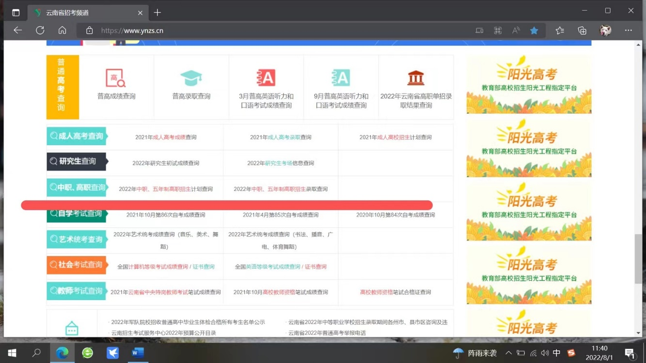 考生可自行登陸云南省招考頻道(http://www.ynzs.cn),下拉找到“中職、高職查詢”入口,點(diǎn)擊“2022年中職、五年制高職招生錄取查詢”,輸入考生信息后方可進(jìn)行查詢。