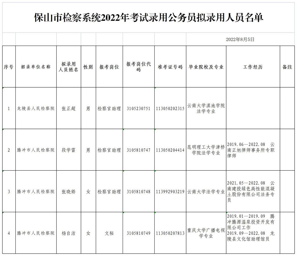 根據(jù)《云南省2022年度考試錄用公務(wù)員公告》規(guī)定,經(jīng)過筆試、面試、體檢、考察等程序,擬錄用張正超等4名同志到保山市檢察系統(tǒng)工作,現(xiàn)予以公示。