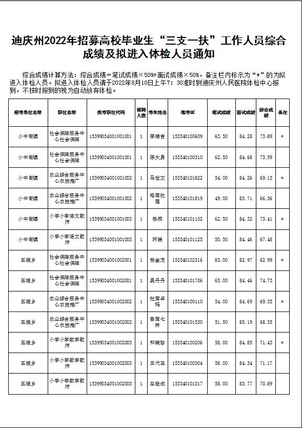 迪慶州2022年招募高校畢業(yè)生“三支一扶”工作人員綜合成績及擬進(jìn)入體檢人員通知