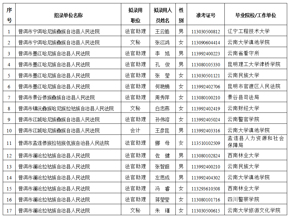 根據(jù)《云南省2022年度考試錄用公務(wù)員公告》《云南省法檢系統(tǒng)2022年度考試錄用公務(wù)員資格復(fù)審及面試等后續(xù)工作方案》精神和省級(jí)公務(wù)員主管部門的總體部署,普洱市法院系統(tǒng)2022年考試錄用公務(wù)員工作,經(jīng)上報(bào)計(jì)劃、網(wǎng)絡(luò)報(bào)名、筆試、資格復(fù)審、面試、體檢、考察工作程序。現(xiàn)將普洱市法院系統(tǒng)17名擬錄用人員公示如下: