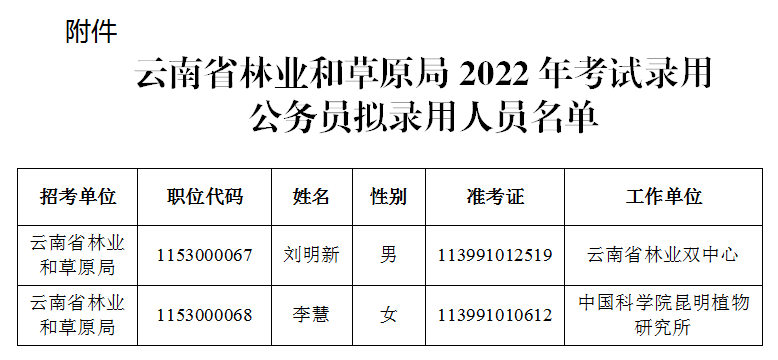 云南省林業(yè)和草原局2022年考試錄用公務(wù)員擬錄用人員名單公示