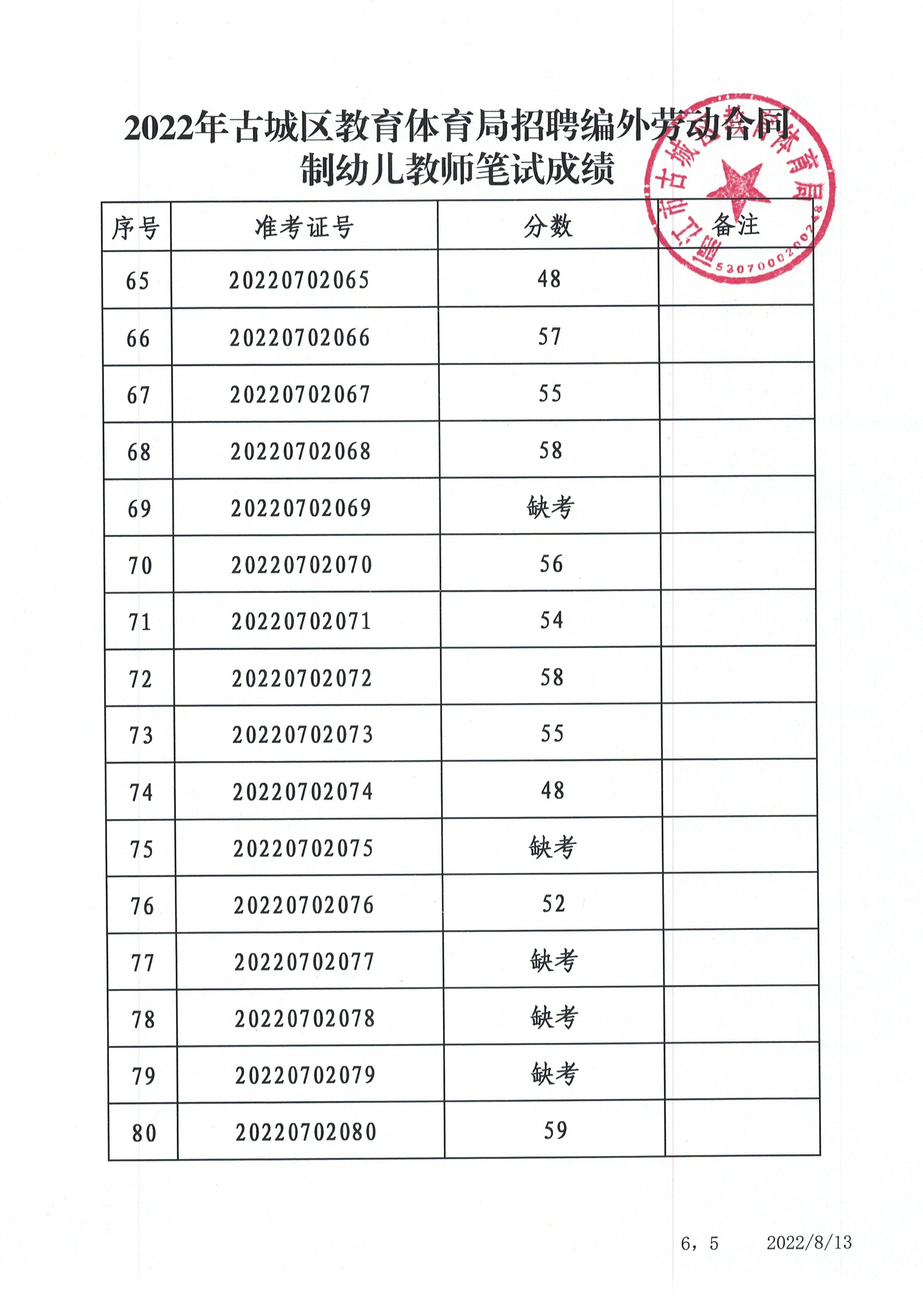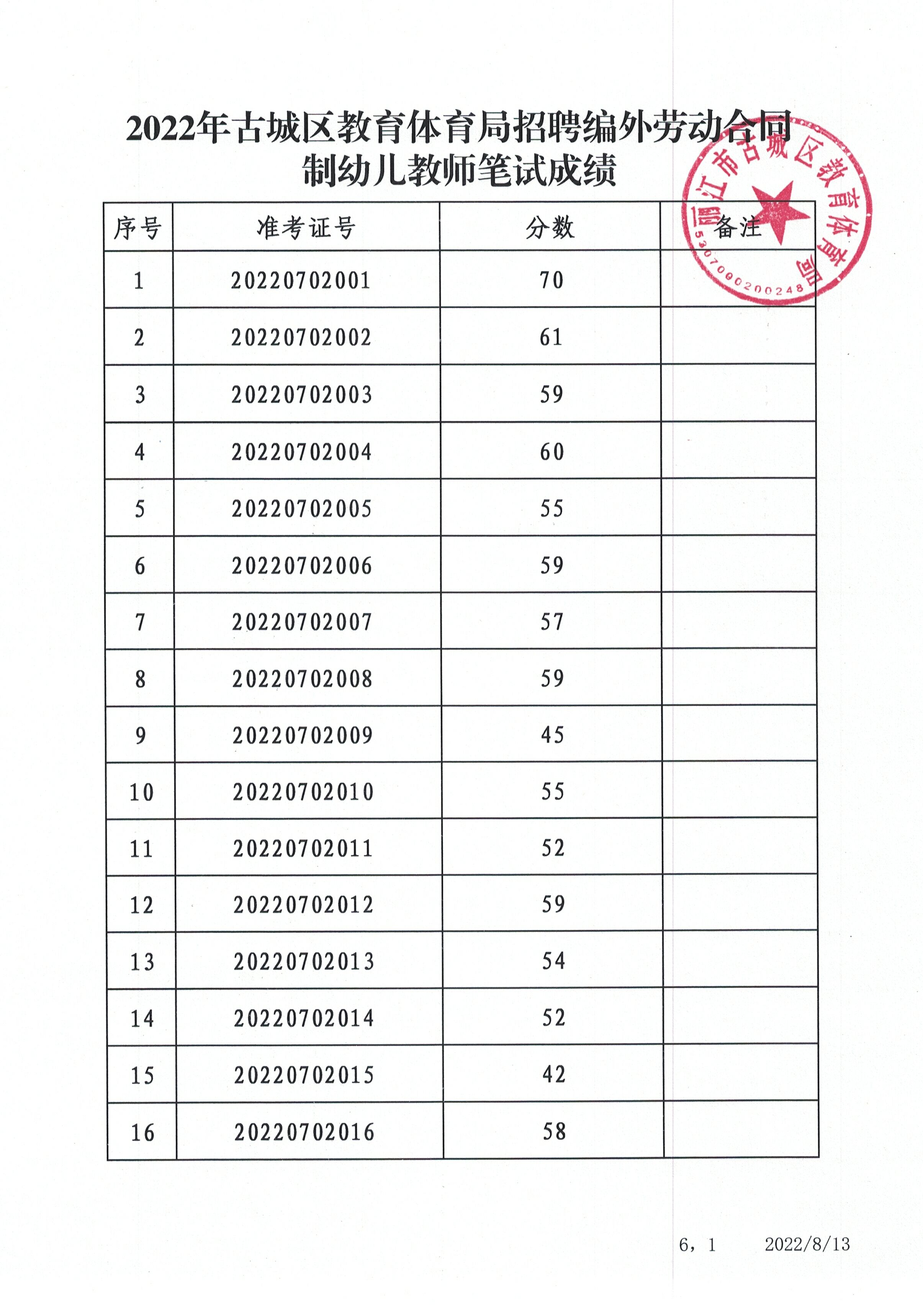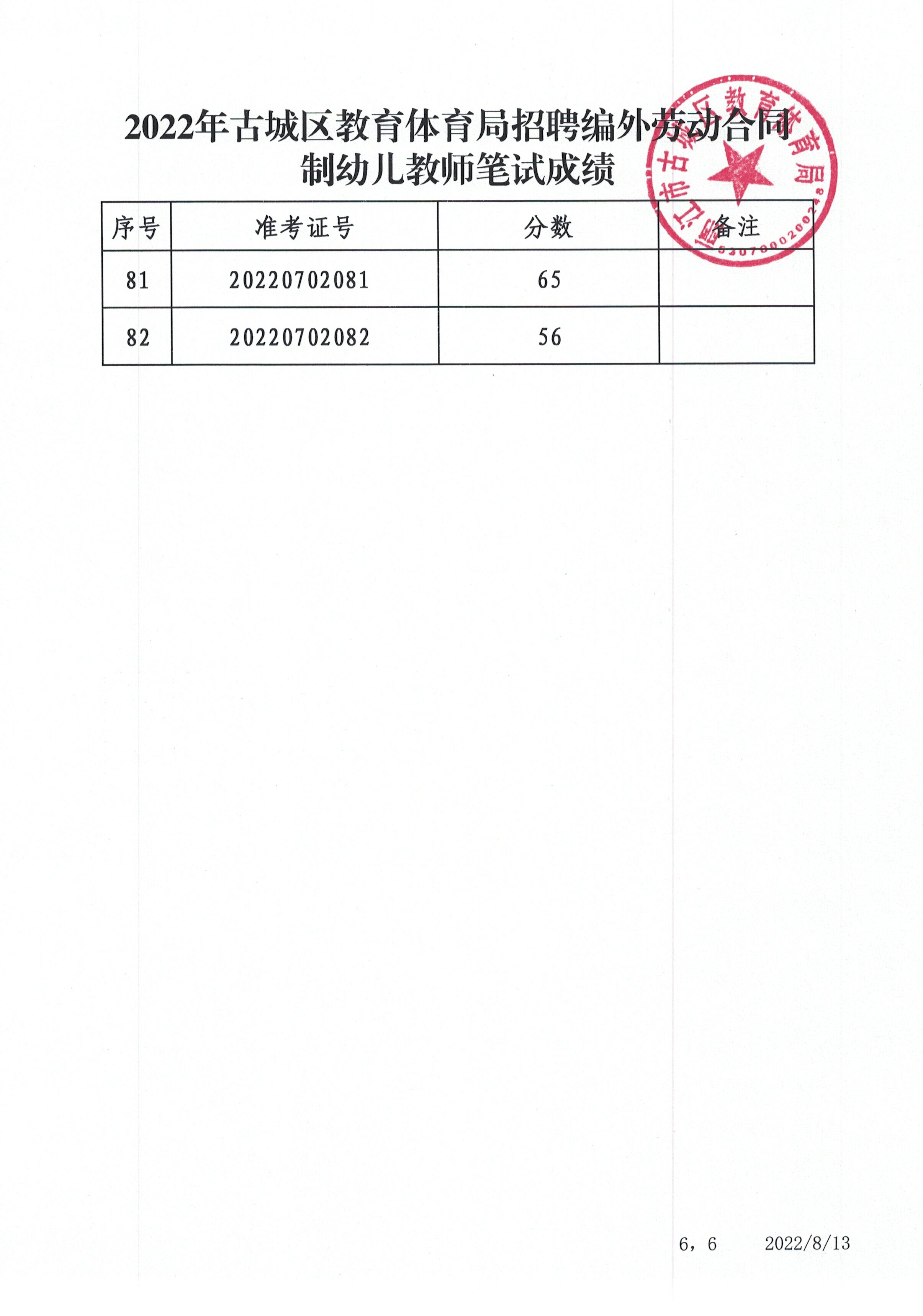 2022年古城區(qū)教育體育局招聘編外勞動(dòng)合同制幼兒教師筆試成績(jī)