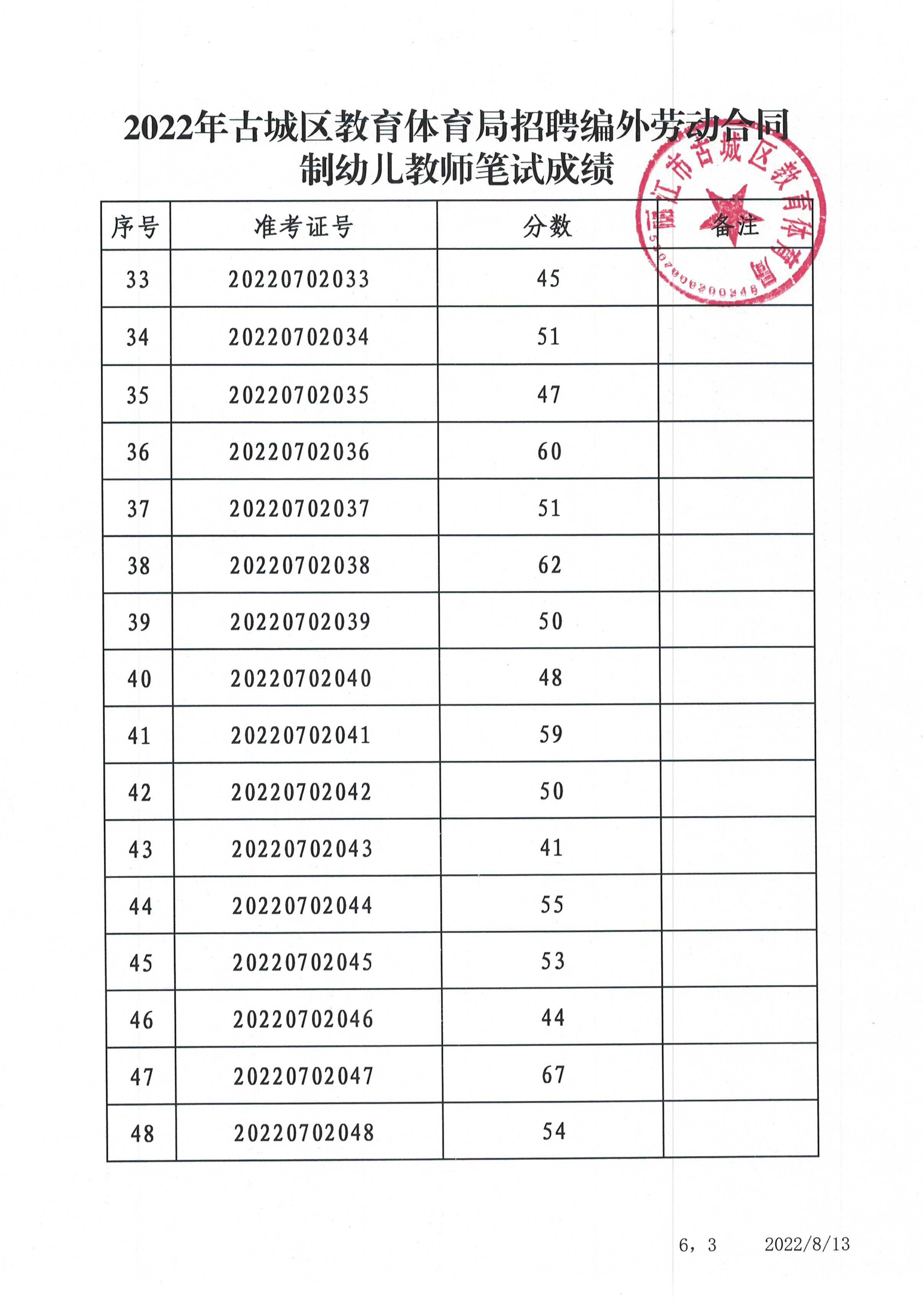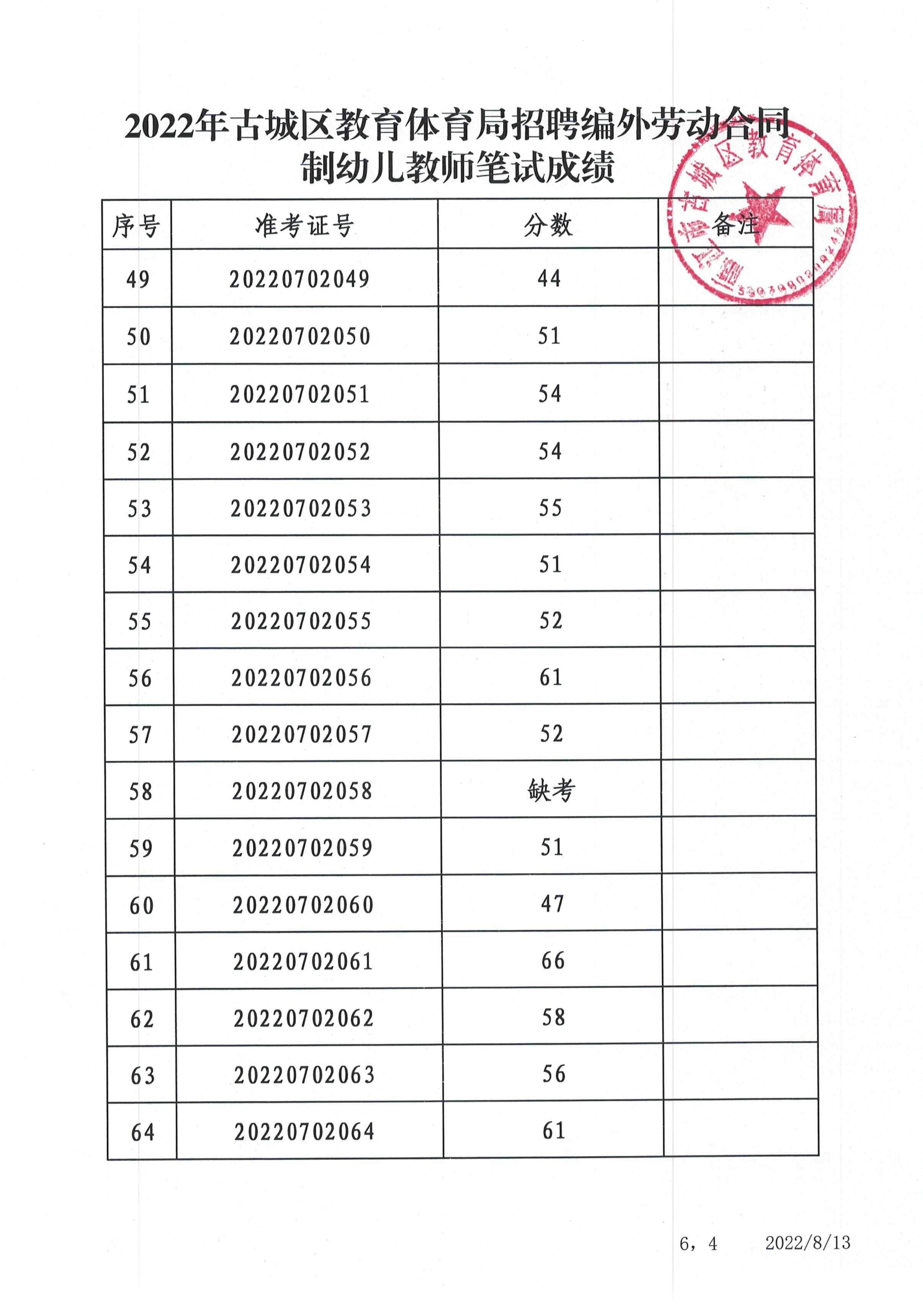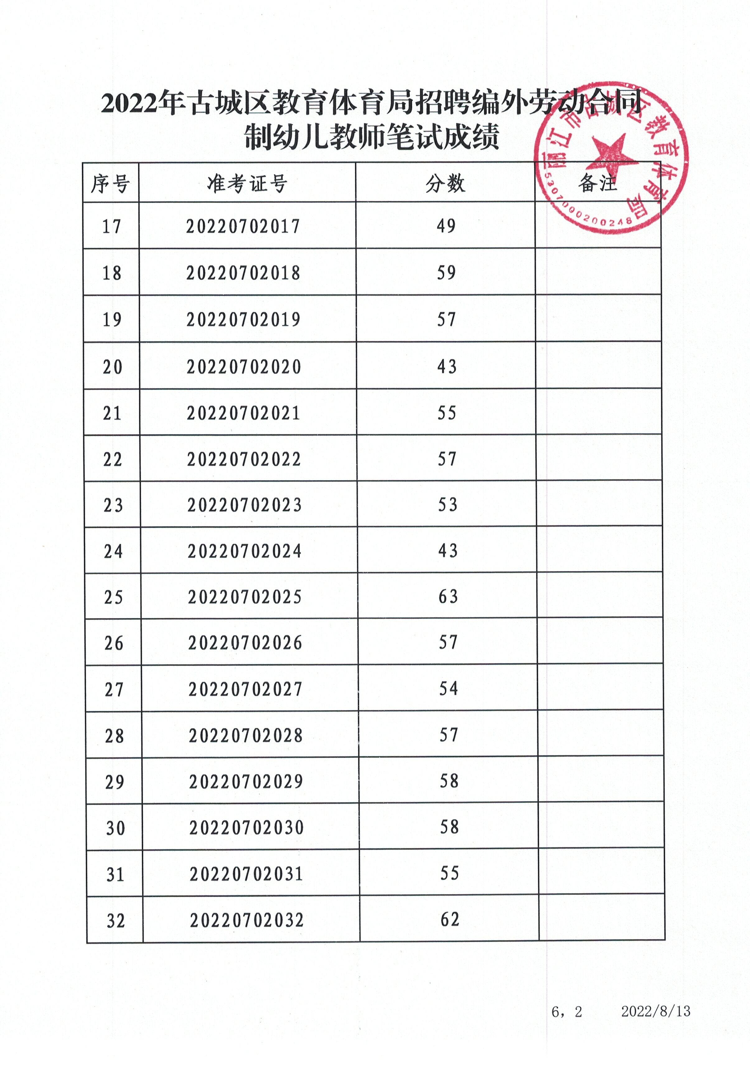 2022年古城區(qū)教育體育局招聘編外勞動(dòng)合同制幼兒教師筆試成績(jī)
