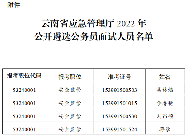 附件:云南省應(yīng)急管理廳2022年度公開遴選公務(wù)員進(jìn)入面試人員名單