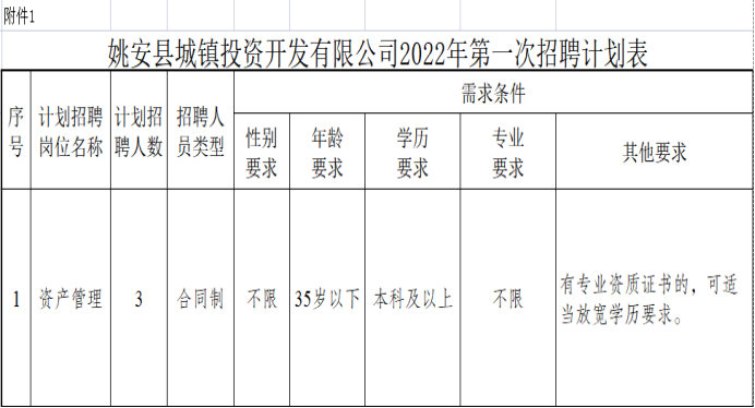 附件1:姚安縣城鎮(zhèn)投資開發(fā)有限公司2022年第一次招聘計劃表