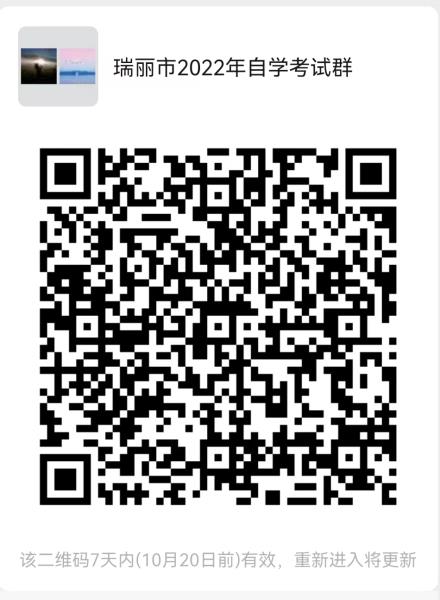1. 瑞麗市2022年自學考試群二維碼,請參加自學考試的考生必須于10月15日前掃碼進群。