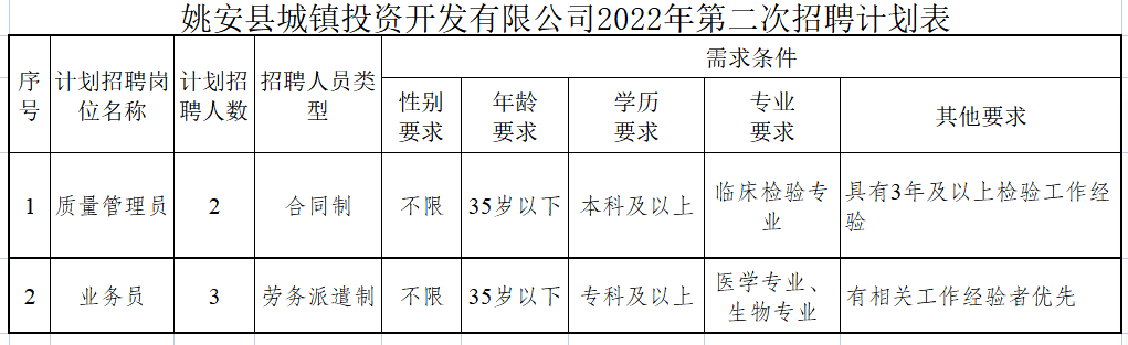 附件1:姚安縣城鎮(zhèn)投資開發(fā)有限公司2022年第二次招聘計劃表
