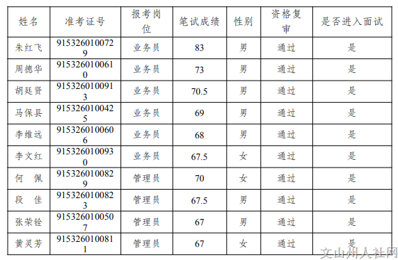 此次公開選調(diào)崗位為專業(yè)技術(shù)業(yè)務(wù)人員2名,管理崗位1名,根據(jù)筆試成績從高到低的順序,按照選調(diào)計(jì)劃和參加面試人數(shù)1:3的比例進(jìn)行資格復(fù)審,現(xiàn)將確定面試人員公布如下。