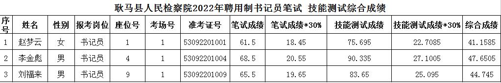 耿馬縣人民檢察院2022年聘用制書記員招聘筆試技能測試綜合成績公示