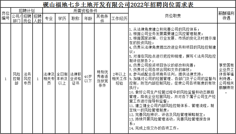 硯山福地七鄉(xiāng)土地開發(fā)有限公司成立于2016年8月,是經(jīng)硯山縣人民政府批準(zhǔn),硯山縣人民政府國有資產(chǎn)監(jiān)督管理局出資組建的具有獨(dú)立法人資格的國有獨(dú)資公司,注冊(cè)資金2億元人民幣。為滿足公司發(fā)展需求,保障公司各項(xiàng)工作能更有效率的開展,現(xiàn)將有關(guān)招聘事項(xiàng)公告如下: