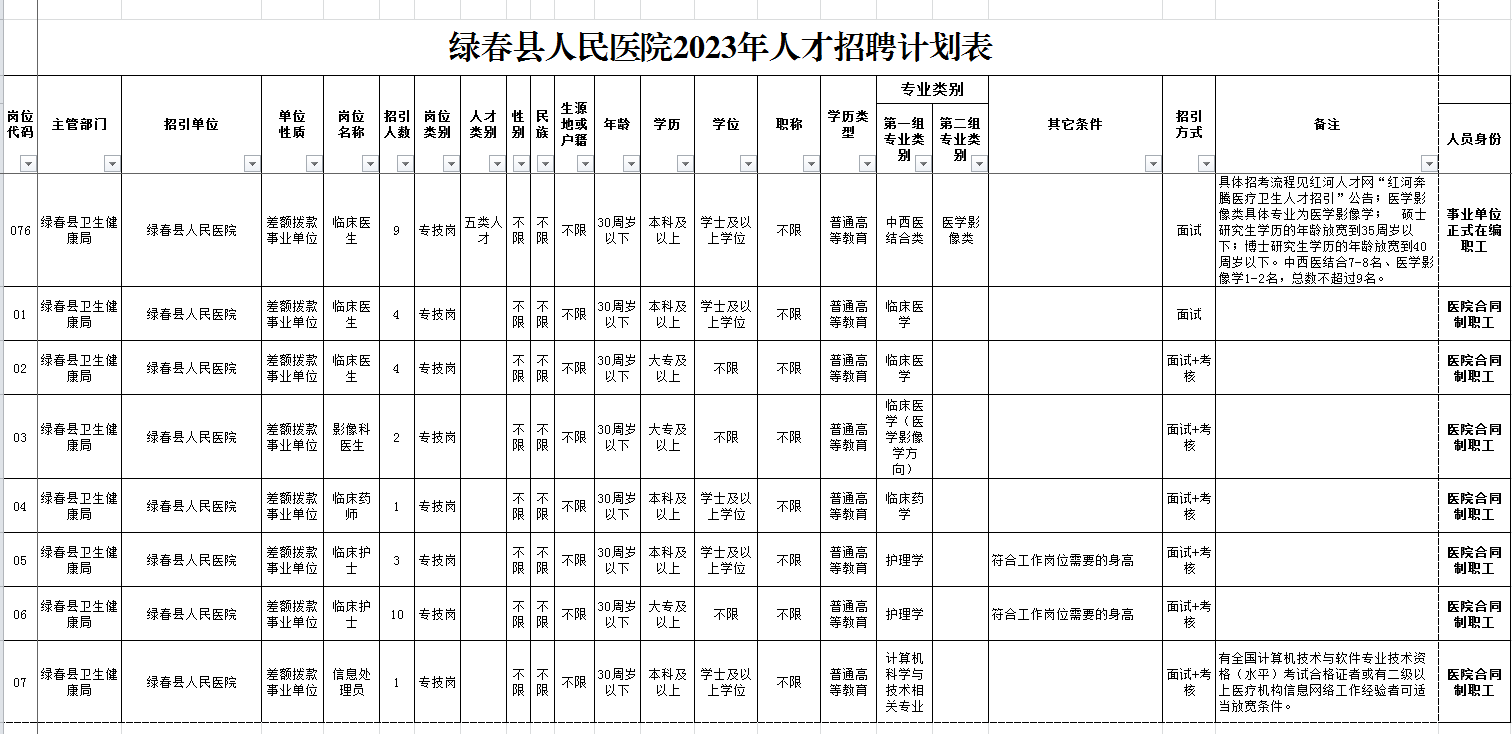 2.醫(yī)院合同制職工25名,具體見附件《綠春縣人民醫(yī)院2023年人才招聘計劃表》,報名截止時間為2023年2 月20日。人員招滿為止,具體面試(考核),結(jié)合現(xiàn)場招聘情況及醫(yī)院安排決定。??茖W(xué)歷需要面試、筆試。