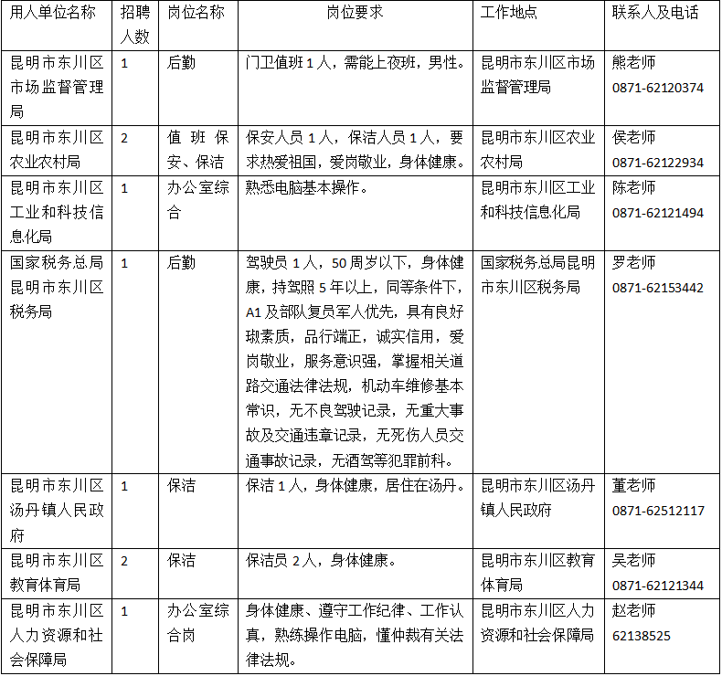一、招聘人數(shù)及崗位情況:本次招聘公益性崗位9名,詳見(jiàn)《東川區(qū)公益性崗位招聘崗位表》。