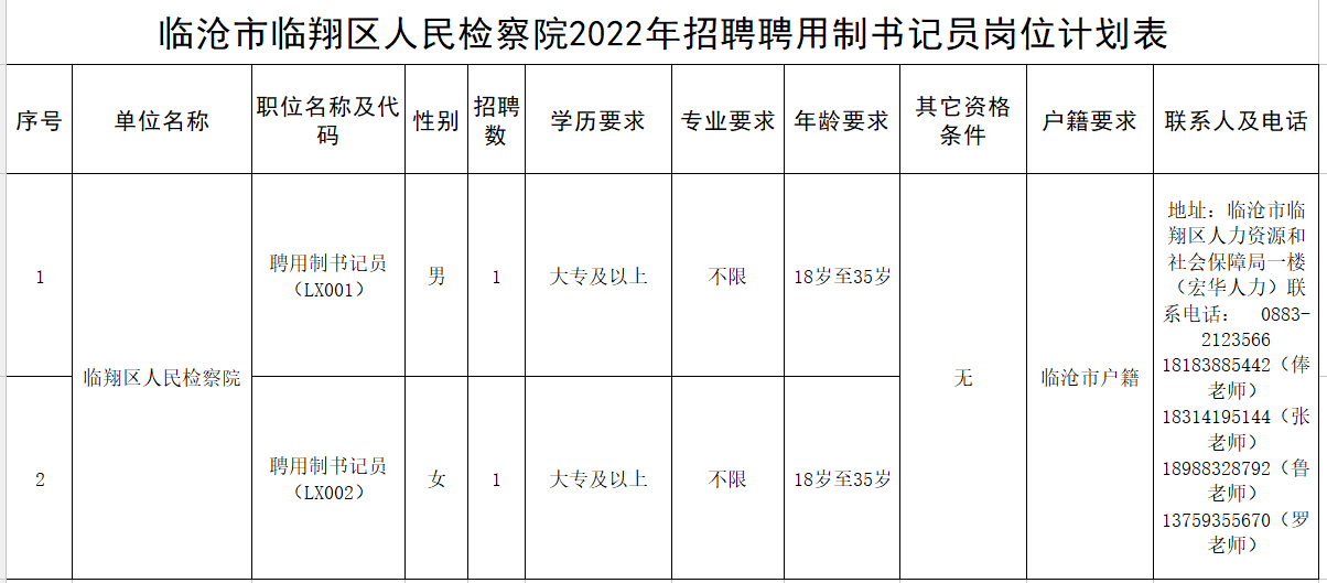 咨詢電話:詳見《臨滄市臨翔區(qū)人民檢察院2022年招聘聘用制書記員崗位計(jì)劃表》