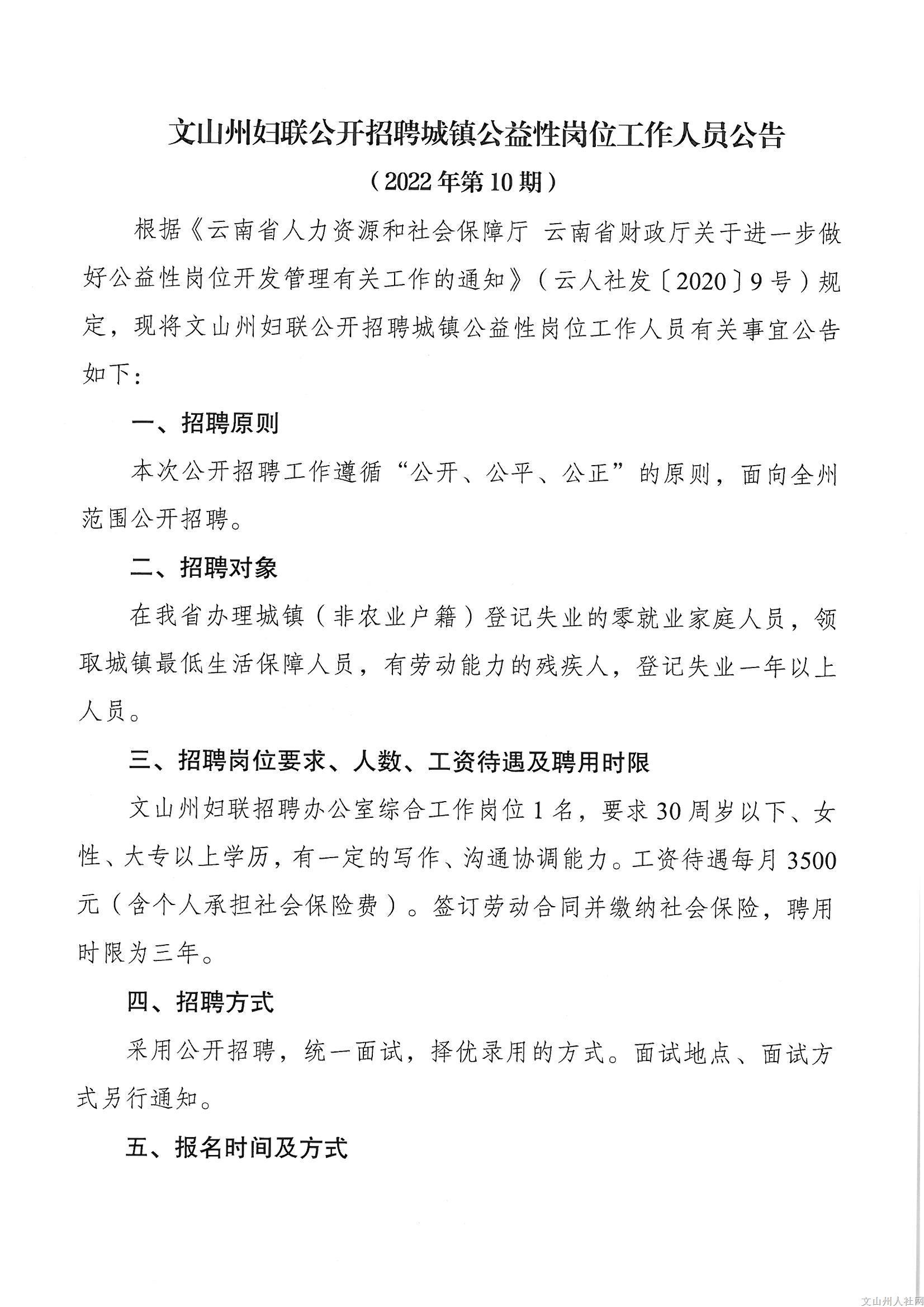 文山州婦聯(lián)公開招聘公益性崗位工作人員公告(2022年第10期)