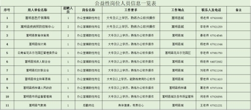 招聘具體事宜請咨詢用人單位。符合公益性崗位上崗條件的個人也可以到嵩明縣勞動就業(yè)服務(wù)局綜合科申請公益性崗位求職登記,詳詢陳老師:0871-67917444。