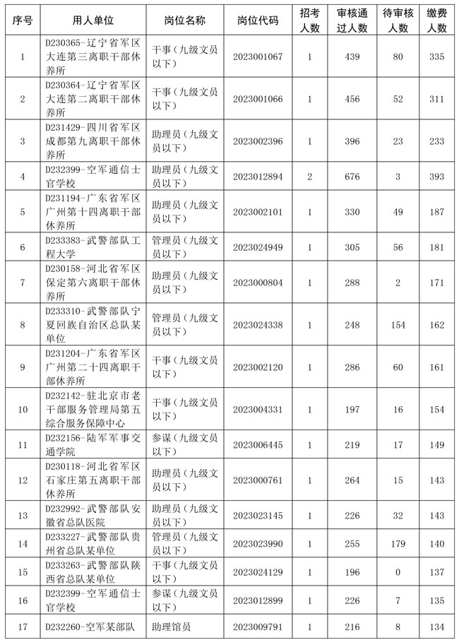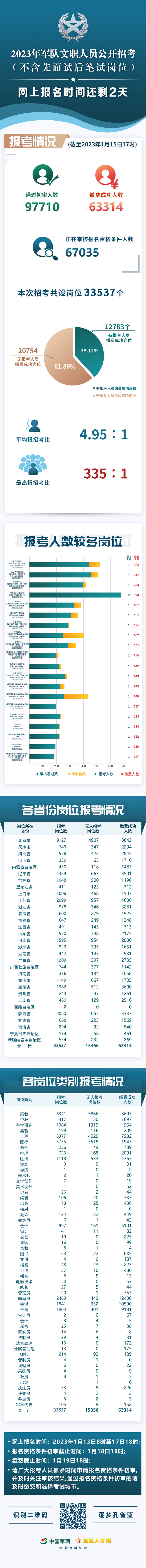 2023年軍隊文職人員公開招考網上報名火熱進行中。截至1月15日17時,通過網上報名資格條件初審的報考人員97710名,繳費成功的報考人員63314名,正在審核報名資格條件的報考人員67035名。有報考人員完成繳費的崗位12783個、占38.12%,平均報招考比為4.95∶1,最高報招考比為335∶1。此次招考網上報名時間還剩2天,請廣大報考人員抓緊時間申請報名資格條件初審,并及時關注審核結果,通過報名資格條件初審的請及時繳費和選擇考試城市。相關招考崗位報考情況如下: