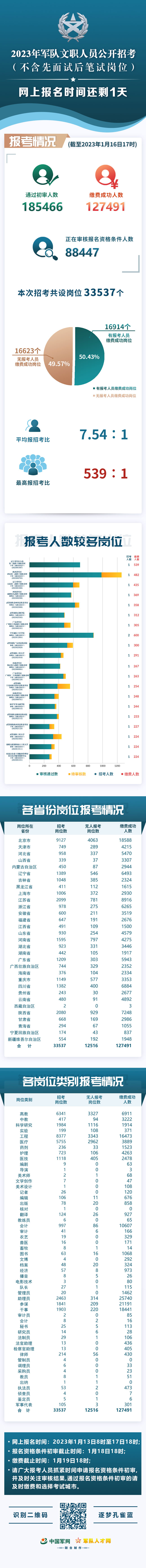 2023年軍隊(duì)文職人員公開(kāi)招考網(wǎng)上報(bào)名火熱進(jìn)行中。截至1月16日17時(shí),通過(guò)網(wǎng)上報(bào)名資格條件初審的報(bào)考人員185466名,繳費(fèi)成功的報(bào)考人員127491名,正在審核報(bào)名資格條件的報(bào)考人員88447名。有報(bào)考人員完成繳費(fèi)的崗位16914個(gè)、占50.43%,平均報(bào)招考比為7.54∶1,最高報(bào)招考比為539∶1。此次招考網(wǎng)上報(bào)名時(shí)間還剩1天,請(qǐng)廣大報(bào)考人員抓緊時(shí)間申請(qǐng)報(bào)名資格條件初審,并及時(shí)關(guān)注審核結(jié)果,通過(guò)報(bào)名資格條件初審的請(qǐng)及時(shí)繳費(fèi)和選擇考試城市。相關(guān)招考崗位報(bào)考情況如下: