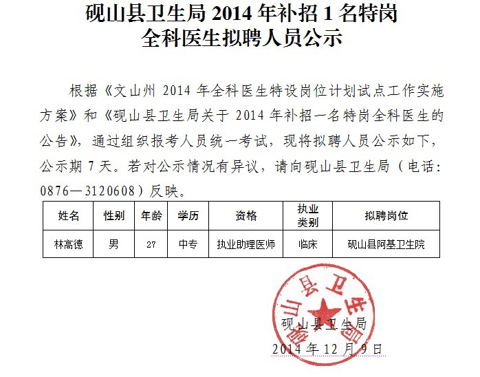 文山州硯山縣衛(wèi)生局2014年補招1名特崗全科醫(yī)生擬聘人員公示